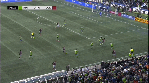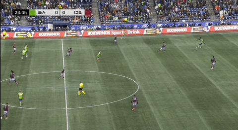 Sounders in possession in the 24th minute. Before the gif, this play actually started the same way as the last one - Sounders have regained in possession in their own end, Nouhou Tolo on the ball, Rapids pressing with (thankfully) just three players. Nouhou breaks lose and the Sounders shift it to their right side, which is where our gif begins. Yeimar Andradé steps past a charging Cole Bassett to neutralize him. Then he passes to Nico Lodeiro, as the heads of Michael Barrios and Ralph Priso whip around. The two of them didn’t close down Yeimar, or step into the passing lane, or mark Lodeiro. They’re simply cut out.