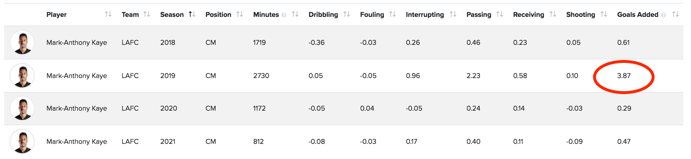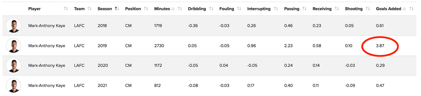 But of course, that’s the question. Is Kaye in his prime, and productive? Kaye was exceptional for LAFC in 2019, and not so much since then.