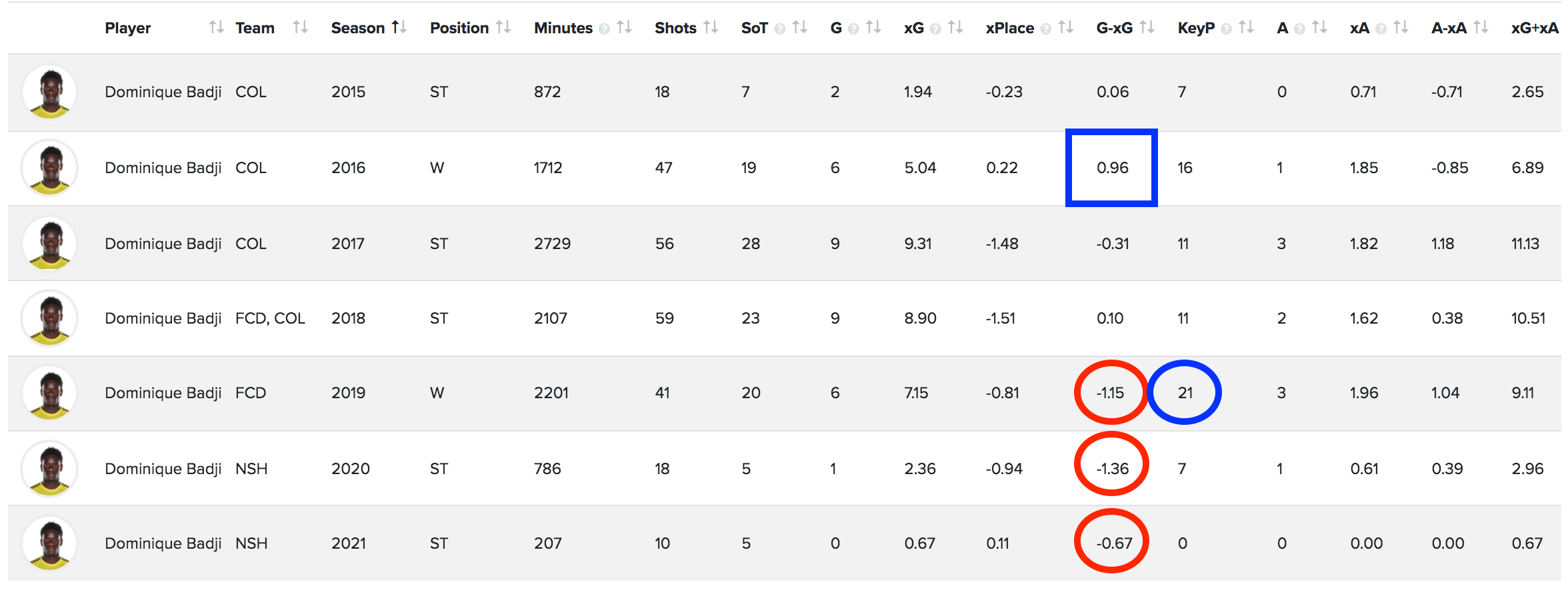 Badji has not been significantly productive since 2018, the year the Rapids sent him on to Dallas … and has just one year in which he produced goals at or above the rate that xG would predict. In 2016, he had a +0.96 G-xG; meaning big data would indicate he ought to have scored 5.04 goals that year, but he scored 6. Other than that, he’s scored at below what you would hope for. I mean, sure, he was pretty handy in 2017 when he scored 9 goals, but look at that monster number of minutes played. The question that likely went through the Front Office’s mind at the end of that year was, ‘hey, if we gave anybody else 2729 minutes - Jack Bean or Kei Kamara or a top-5 USL striker - wouldn’t they also score 9 goals?’ And thus, Badji was deemed expendable, and he was, uh, expended in the deal that acquired Kellyn Acosta.