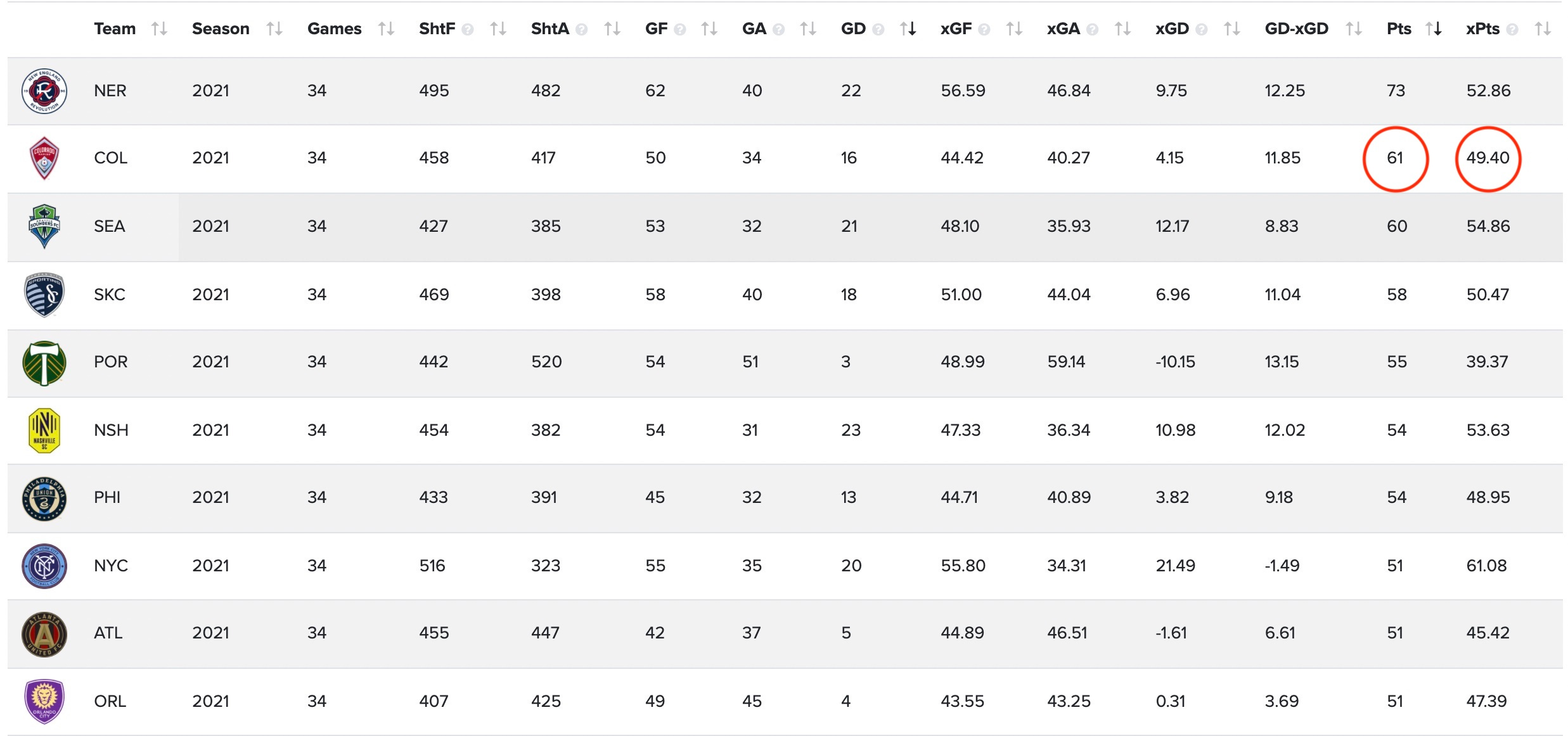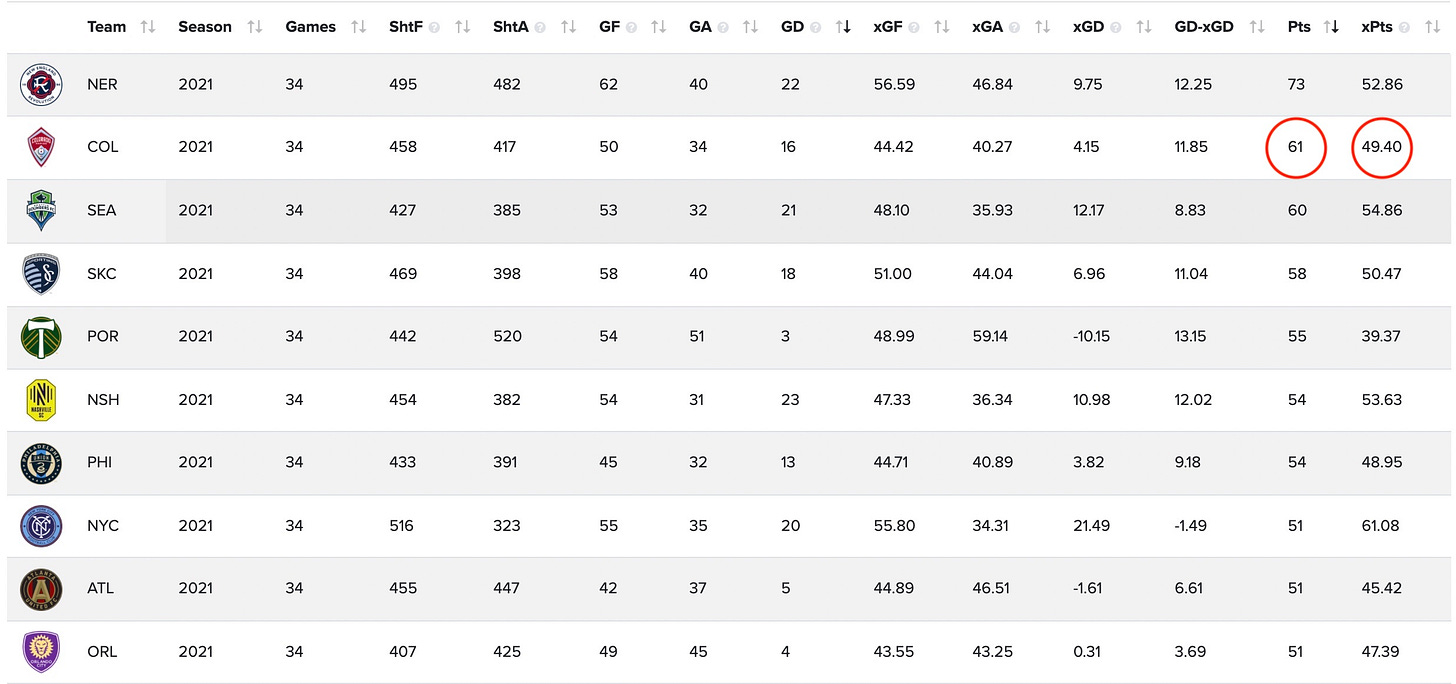 As you can see above, xPoints thinks the Rapids would have finished with 49.20 points, rather than the 61 points they did finish with. If every team finished according to xPoints, the Rapids would have finished 11th overall in the league table.