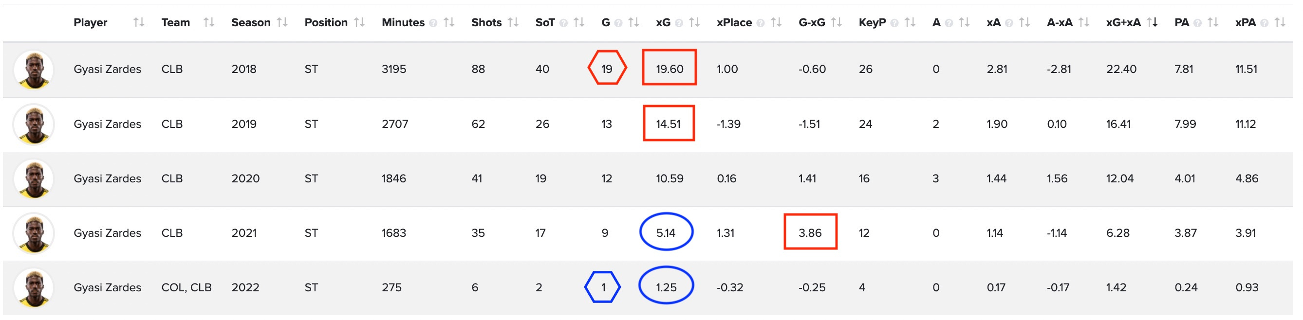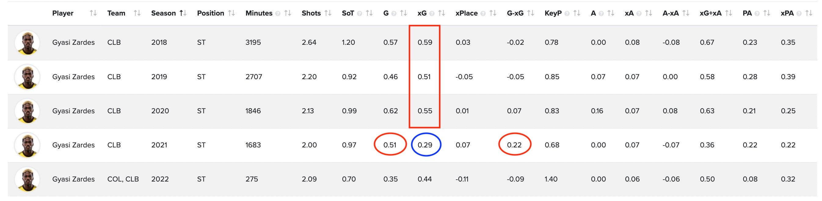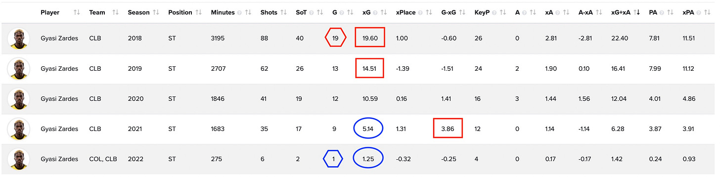 As you can see, Zardes’ Expected Goals has been in steady decline since that spectacular 2018 year to the point that it was just 5.14 last season. But look over a column, and you’ll see that Gyasi banged in 9 goals that year - well-above expectation - for a G-xG of +3.86. That’s the 12th-best rate in MLS last year - up there with big names like Gustavo Bou (+5.22) and Chicharito (+4.13). So perhaps as he ages, he is getting fewer chances, but finishing more efficiently. The 2022 numbers aren’t as good, but then again, they’re based on just 275 minutes of data, which simply isn’t enough to know anything.