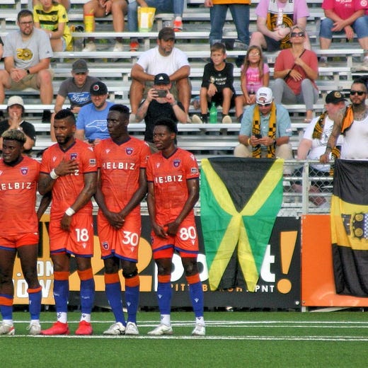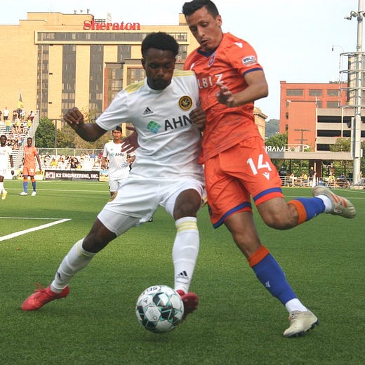 I will just briefly tell you about the third pic from the tweet above - the one of Riverhounds defender Jalen Robinson and Miami FC’s Baggio Kcira jostling for the ball. I had a short lens on for close-in shots, and saw Miami’s midfielder square it up for a cross to the left, so I adjusted myself to focus on Kcira. He received the ball and pushed it out in front of himself, and the two players immediately start shoving and running for it.