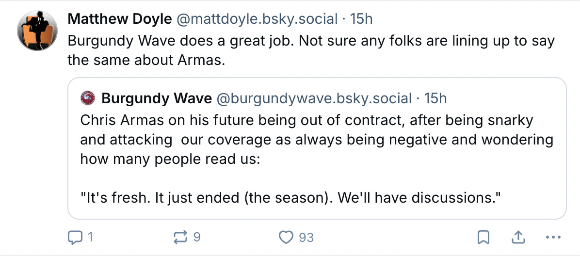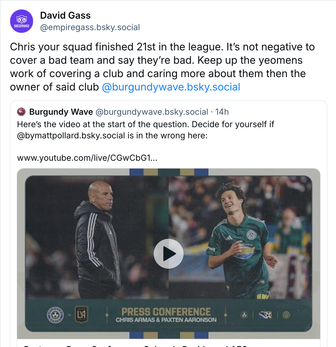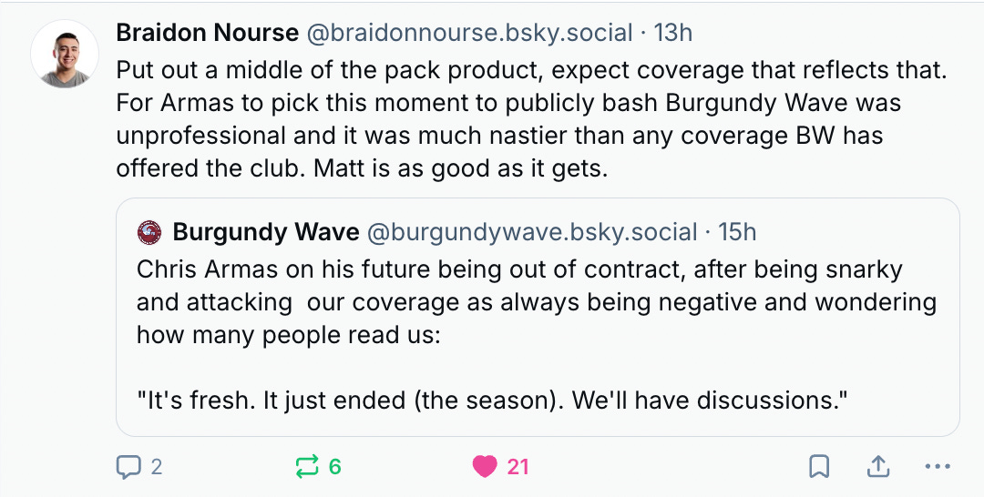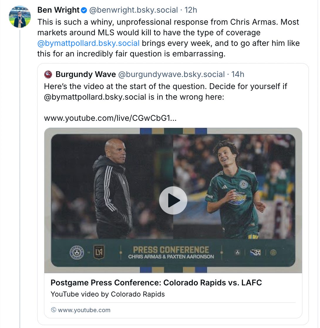 I get that Armas is likely frustrated at the end of a long and unsuccessful season, but to turn his ire towards Burgundy Wave - the only outlet in the state of Colorado that has consistently covered the Rapids for the past fifteen years - is wrongheaded and petty. I’m not the only person that thought Chris was off-base here, either. Here’s social posts from Ben Wright, David Gass, Braidon Nourse, and Matt Doyle expressing their support for Matt and disappointment in you, Chris.