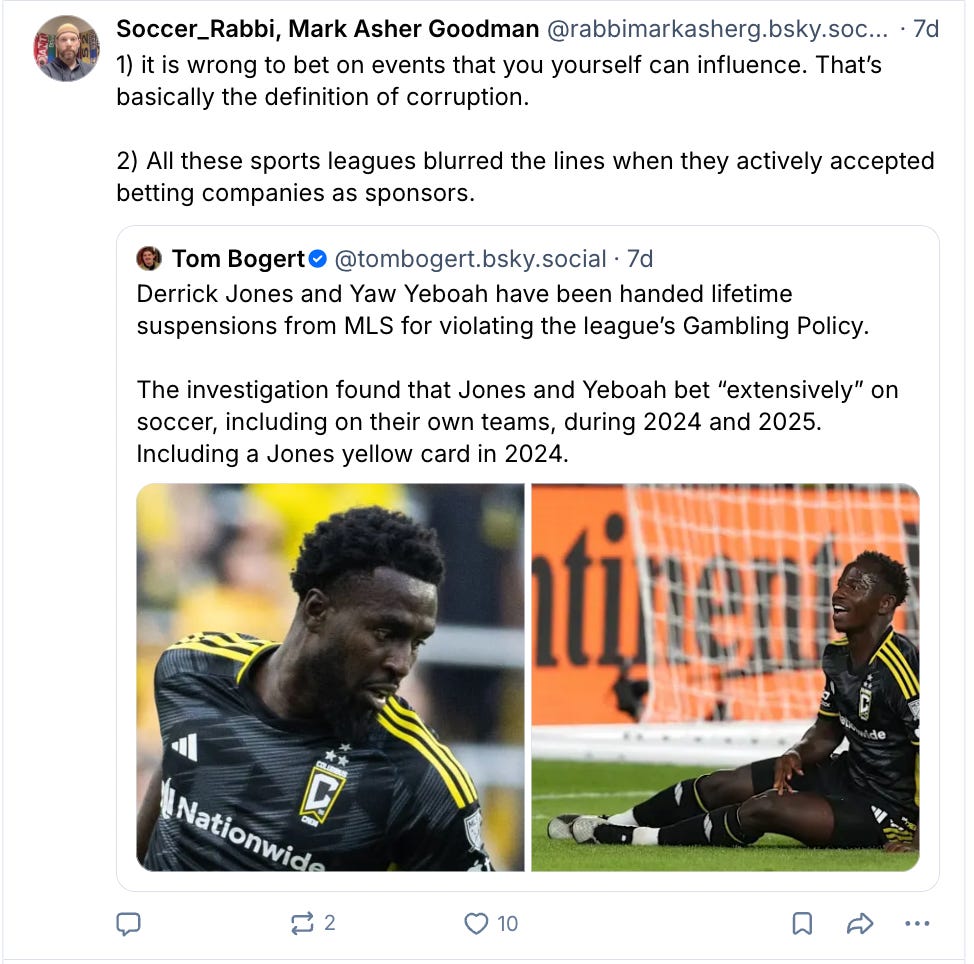 It was the height of irony that not 24 hours after I started posting about my successful bets on MLS games, MLS announced that they were banning two players, Yaw Yeboah and Derrick Jones, for life, for betting on MLS games.
