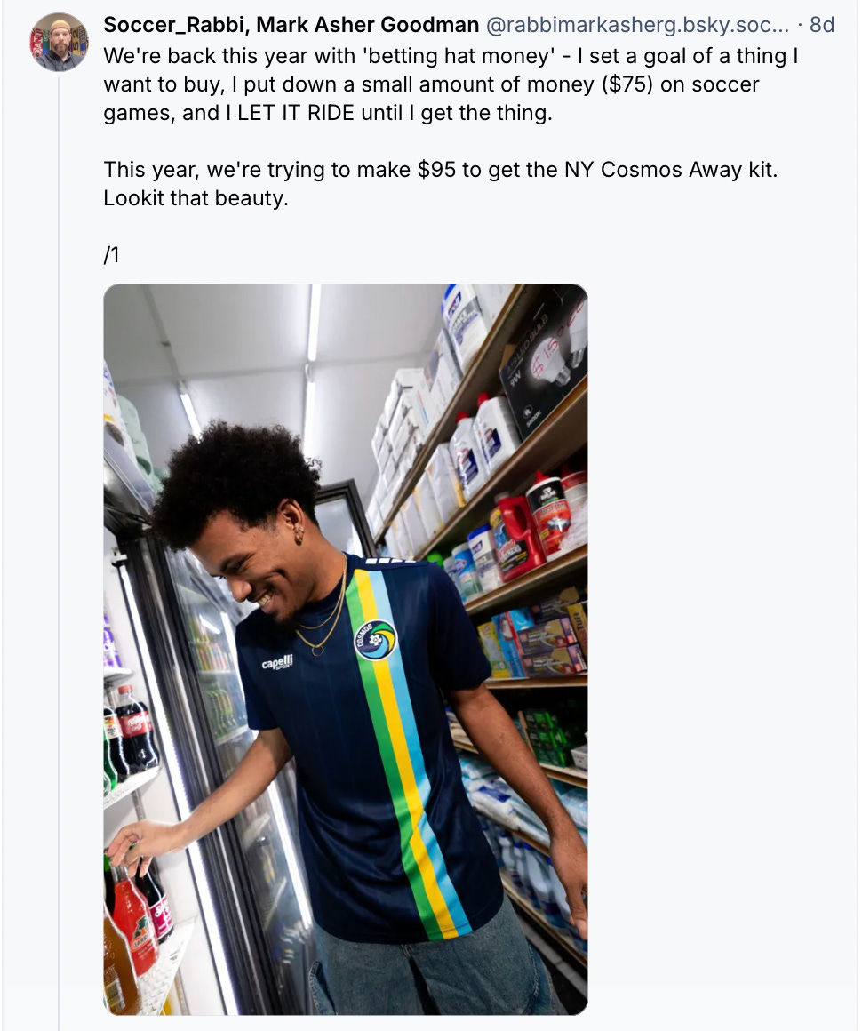 And this year, I’m doing Hat Money again. I’m calling it ‘Kit Money’ - because I saw the new NY Cosmos4 second kit and I WANTED IT SO BAD.