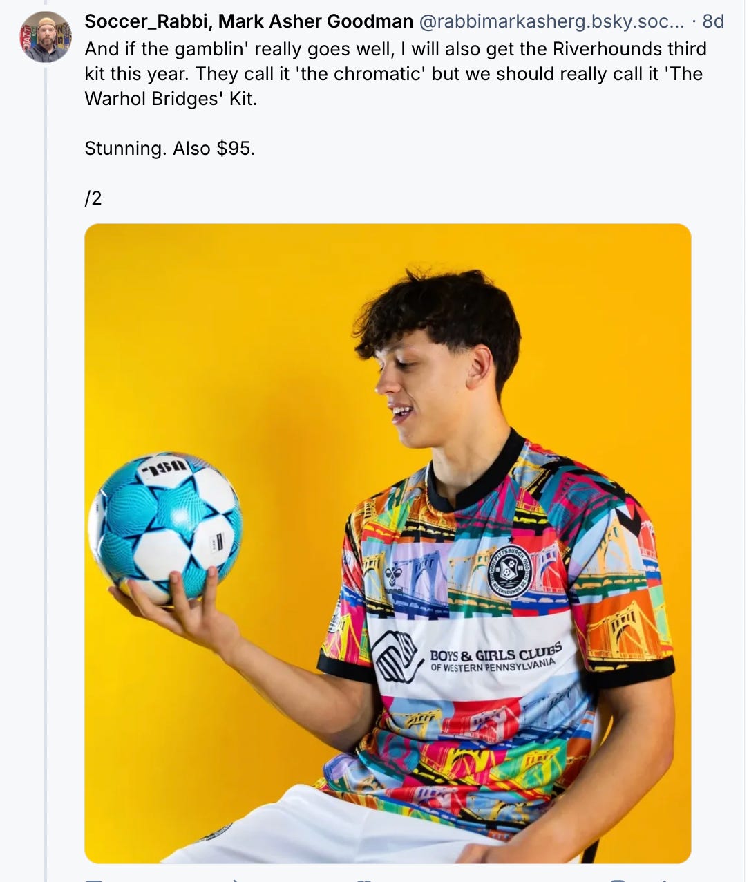 My approach to betting, I’ve mentioned in fits and spurts throughout this article. First, I come with a small and reasonable amount of money to bet, and when I lose it, that’s it. And I also set an amount at which I am ‘out’ if I win it: this time it’s $95 for a first kit, and $95 for a second kit after I buy the first. Because the Riverhounds third kit this year is STRAIGHT FIRE.