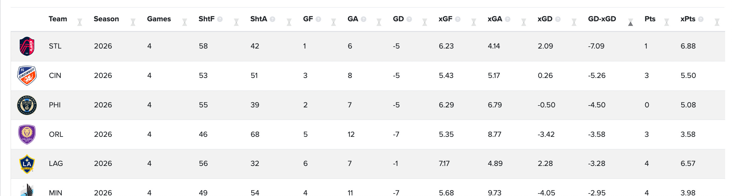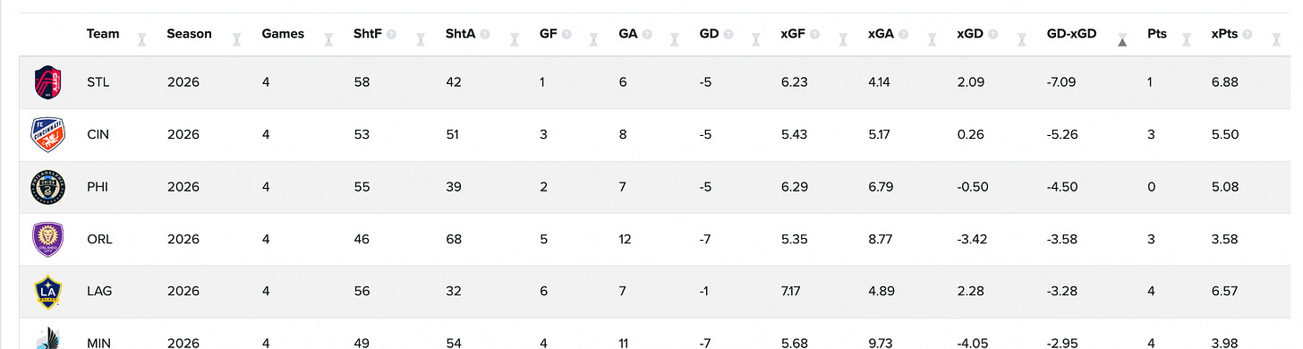 Philadelphia are a mess and I wouldn’t touch them with a ten foot pole. But the others are giving indications that the sports books will put them as underdogs, when they might just be unlucky. SKC are the ‘bet against’ team in MLS right now: they have 4 pts but only 1.83 Expected Points, and a -3 Goal Differential on a GD-xGD of 2.71. That’s bad.