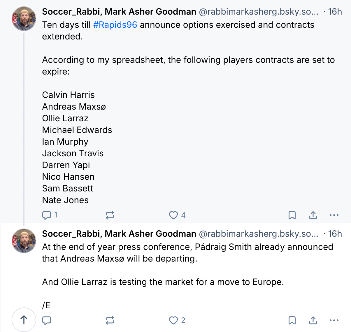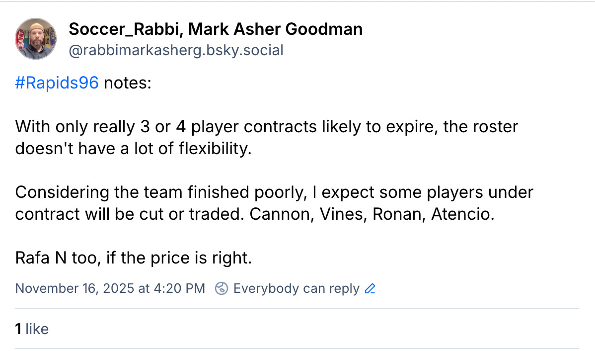 Mike’s been on my Rapids roster spreadsheets since 2021. You know who else was on the 2021 roster? Will Vint, and Matt Hundley, and Phillip Mayaka, and Jeremy Kelly. None of those guys panned out. The Rapids kept hanging on to Edwards hoping he’d develop and breakthrough. At the age of 24, Edwards was mostly a bench player for USL-C’s Charleston Battery in 2025. I think he’ll make a permanent home in USL going forward.